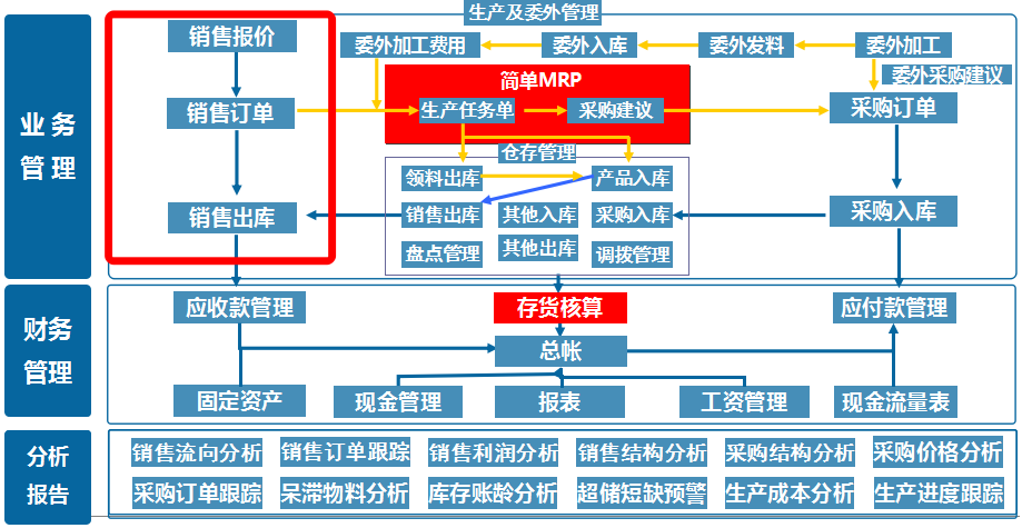 支持现销、赊销、委托代销等多种销售方式;客户信用管理,减少回款风险;多价格管理体系,按客户、数量、时间设置价格;报价管理、订单执行进度跟踪;销售和盈利情况分析、销售业绩分析