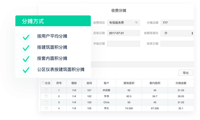 费用分摊支持多种分摊的业务场景,形成分摊方案; 平均分摊,根据建筑/套内面积,公区仪表用量分摊等多种方案; | ![]() |